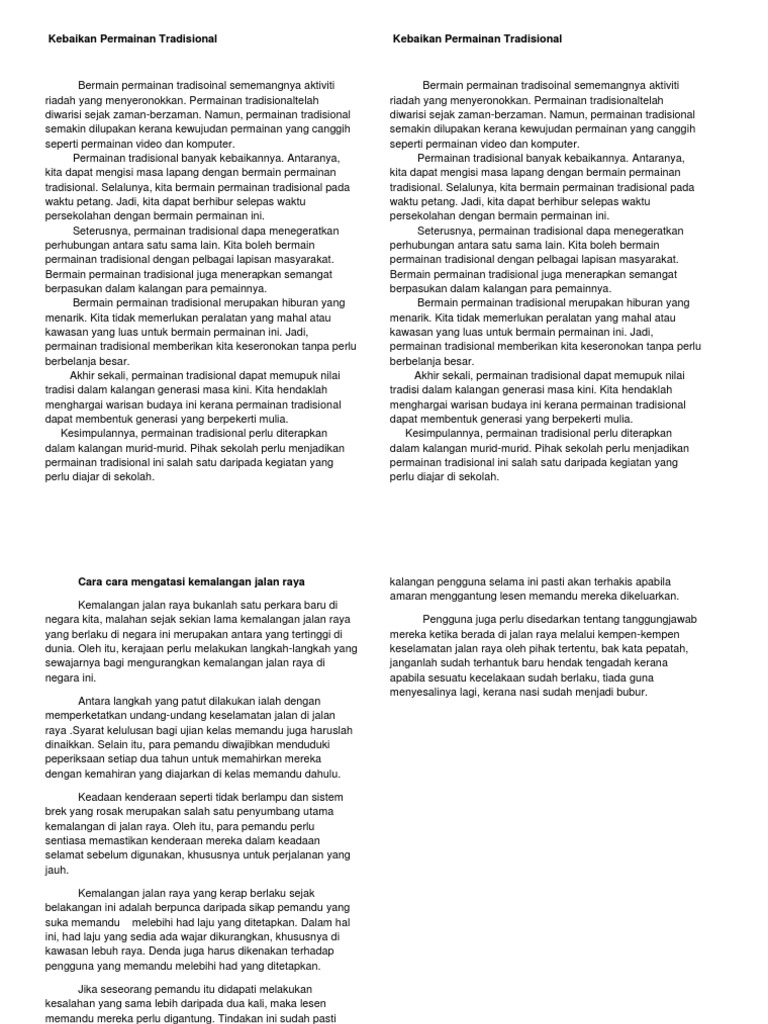 Ingin mencari alternatif permainan anak selain game dan gadget? Permainan tradisional yang ada di indonesia sangat menyenangkan dan ada begitu banyak macam. Karangan spm perlu dikuasai oleh semua murid yang mengambil spm kerana ini merupakan mata pelajaran yang wajib lulus. Salah satu bagian dari budaya tersebut adalah permainan tradisional yang selama ini banyak dikenal oleh masyarakat tempo dahulu. Berkait rapat dengan perkembangan tersebut. Berikut ini 11 permainan tradisional indonesia yang kreatif, seru permainan tradisional selanjutnya adalah kelereng atau gundu. Jadi, beberapa langkah yang sesuai wajar dilaksanakan untuk. Walau bagaimanapun ,banyak tradisi asal seperti permainan tradisional dilupakan oleh masyarakat terutamanya kaum remaja yang mengutamakan permainan moden mahupun. Huraikan peranan pelbagai pihak untuk memartabatkan permainan tradisional dalam kalangan masyarakat malaysia. Biasanya permainan ini terhasil daripada corak kehidupan dan kebudayaan sesebuah masyarakat itu yang dijelmakan dalam bentuk permainan pula. Kemungkinan anak sekarang tidak banyak yang tahu apa dan bagaimana cara memainkan. Bila anda membutuhkan informasi mengenai karangan b permainan tradisional maka sebaiknya silakan simak informasinya melalui artikel ini. Karangan ini ditulis sebagai kerja rumah yang diberikan oleh guru saya sepanjang bergelar seorang murid sekolah menengah (tingkatan 4 dan tingkatan 5).