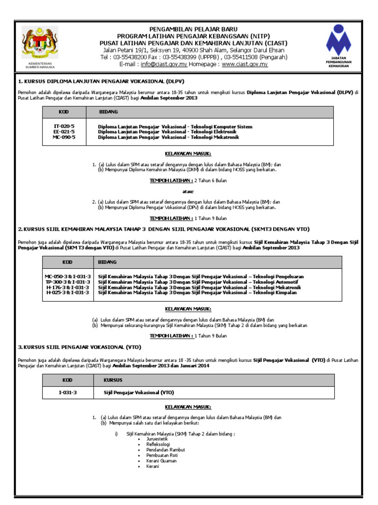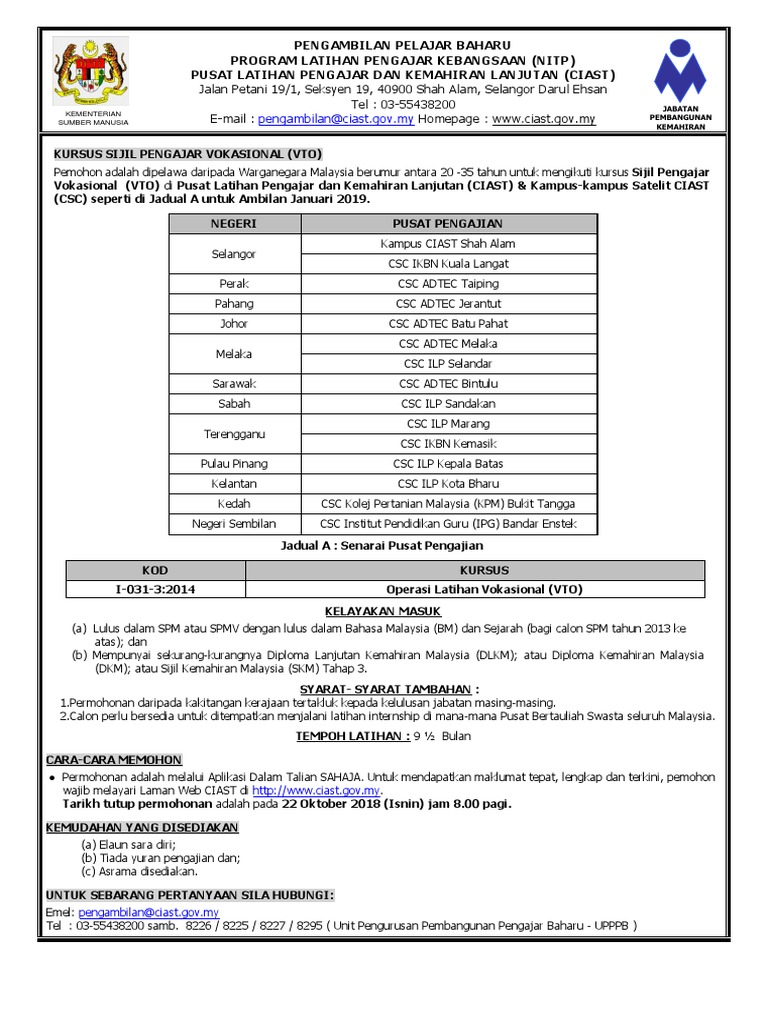 Video selengakapnya boleh diperolehi daripada saya. Use custom templates to tell the right story for your business. Aspek yang dikaji ialah pengetahuan dan kemahiran pelajar dan pengajar vokasional terhadap. Buah pusat pentauliahan kemahiran malaysia iaitu pusat latihan pengajar dan kemahiran lanjutan (ciast) dan institut latihan. Permohonan jawatan kosong pusat latihan pengajar & kemahiran lanjutan (ciast).