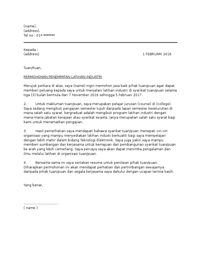 Savesave surat permohonan penempatan latihan industri for later. Contoh surat permohonan latihan industri ini mungkin mempunyai kesalahan. Dari sini bisa kita simpulkan jika surat permohonan itu merupakan surat yang dibuat dengan tujuan untuk meminta bantuan, permohonan izin, dan permohonan lainnya. Oleh itu, latihan industri pada sesi tersebut akan mengikut ketetapan seperti berikut oleh yang demikian, pelajar yang berada di fasa 2 dan fasa 3 sahaja (yang belum mendapat tempat li) dikehendaki untuk menggunakan surat permohonan li & borang jawapan yang baharu (bertarikh. Contoh resume mind mapping (untuk sistem respirasi).