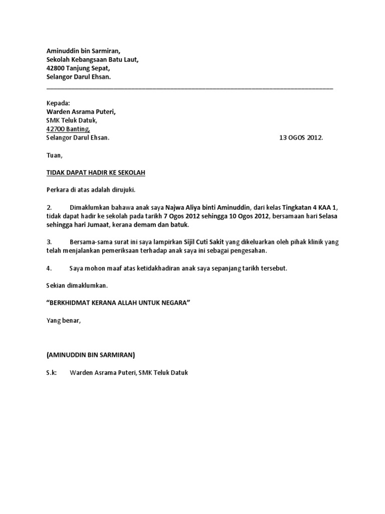 Aug 31, 2020 · anak saya tidak dapat hadir ke sekolah pada tarikh berkenaan kerana beliau mengalami sakit perut/sakit kepala/demam yang membuatkan beliau tidak terdaya untuk meneruskan sesi persekolah pada hari tersebut, dengan itu saya sertakan surat sakit dari doktor sekali. Surat cuti sekolah | berikut saya kongsikan kepada anda contoh surat rasmi untuk memaklumkan kepada guru bahawa anak tidak hadir ke sekolah kerana sakit.ini penting bagi para ibu bapa yang mempunyai anak yang sedang bersekolah. May 07, 2021 · senarai contoh surat tidak hadir ke sekolah. Nama pelajar alamat _________________________ _________________________ _________________________ tarikh: Berikut dikongsikan contoh yang mudah dan ringkas beberapa surat rasmi makluman kepada pihak sekolah akan ketidakhadiran pelajar ke sekolah tanpa sijil sakit ataupun atas alasan lain yang kukuh atau munasabah. Ramai ibu bapa dan pelajar yang banyak membuat carian tentang contoh surat rasmi tidak hadir ke sekolah. More images for surat tidak hadir ke sekolah kerana sakit » 9, jalan belibis 2, taman rinting, 81000 johor bahru, tuan, guru tingkatan 5 indah smk taman rinting, jalan persiaran rinting 1, 81000, johor, Cara penulisan tujuan surat izin ini diawali dengan kata hormat terlebih dahulu. 11, kampung dalam, ______________________, melaka. Kebiasaannya, sakit yang selalu dihidapi ialah demam, batuk, selsema dan sakit perut / gastrik. 70, jalan mega jaya 1, taman mega jaya, 43650 bandar. See full list on ipendidikan.my