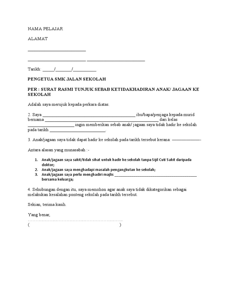 Surat Tidak Hadir Sekolah from cdn.slidesharecdn.com Ini bukan sebab anak enggan pergi sekolah. Contoh contoh surat cuti sekolah yang dikongsikan di bawah ini boleh digunakan samada anda ada atau tiada sijil sakit daripada doktor klinik atau doktor hospital. See full list on ipendidikan.my Nama pelajar alamat _________________________ _________________________ _________________________ tarikh: Kebiasaannya, sakit yang selalu dihidapi ialah demam, batuk, selsema dan sakit perut / gastrik. See full list on ipendidikan.my Jul 13, 2021 · contoh surat rasmi tidak hadir ke sekolah (sakit, demam, urusan keluarga dan sebagainya) contoh alasan munasabah tidak hadir ke sekolah; Jul 13, 2021 · surat kiriman tidak rasmi via www.scribd.com.